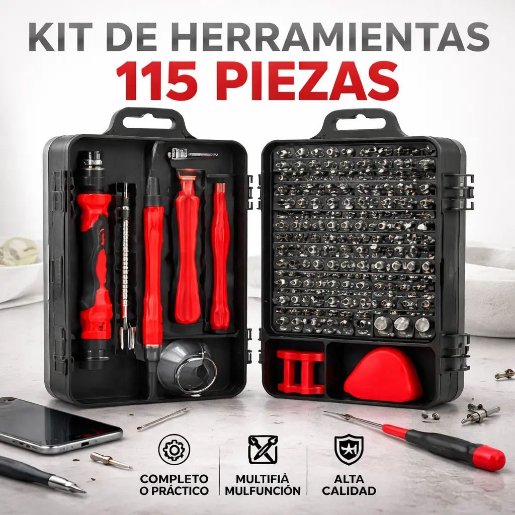 Dejá de buscar herramientas por toda la casa. Con este kit de 115 piezas tenés todo organizado y listo para cualquier tarea, desde arreglos simples hasta proyectos más completos.